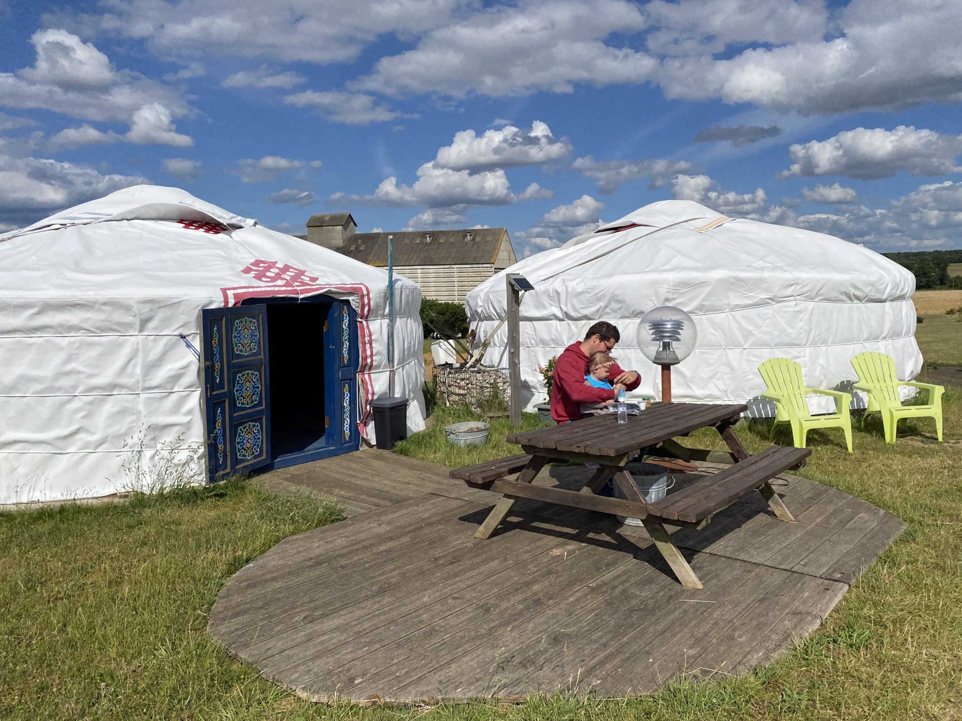 Juin 2020: Après ces deux mois de confinement nous avions envie de prendre l’air. Alors c’est parti direction Chartres pour un petit week end dans une yourte à la ferme! Elia est pressée…