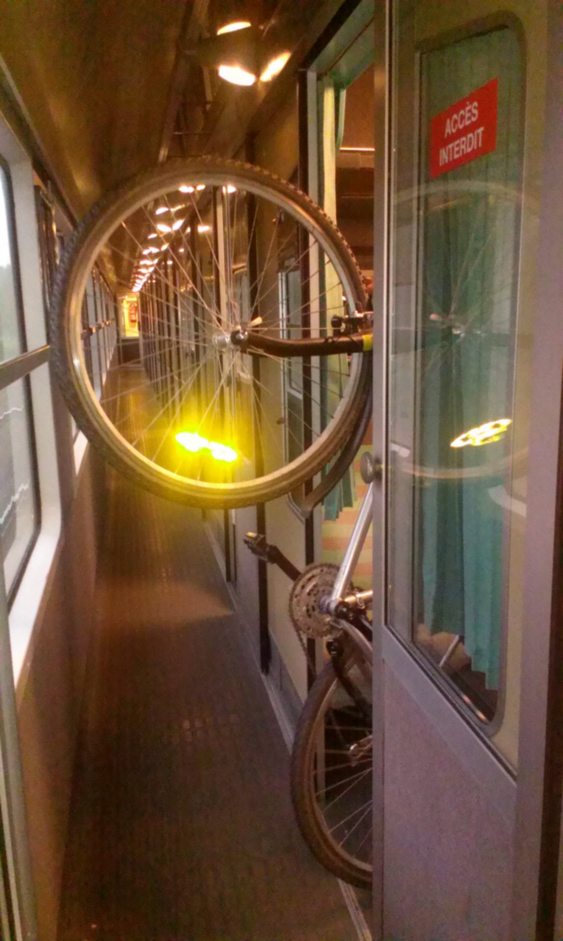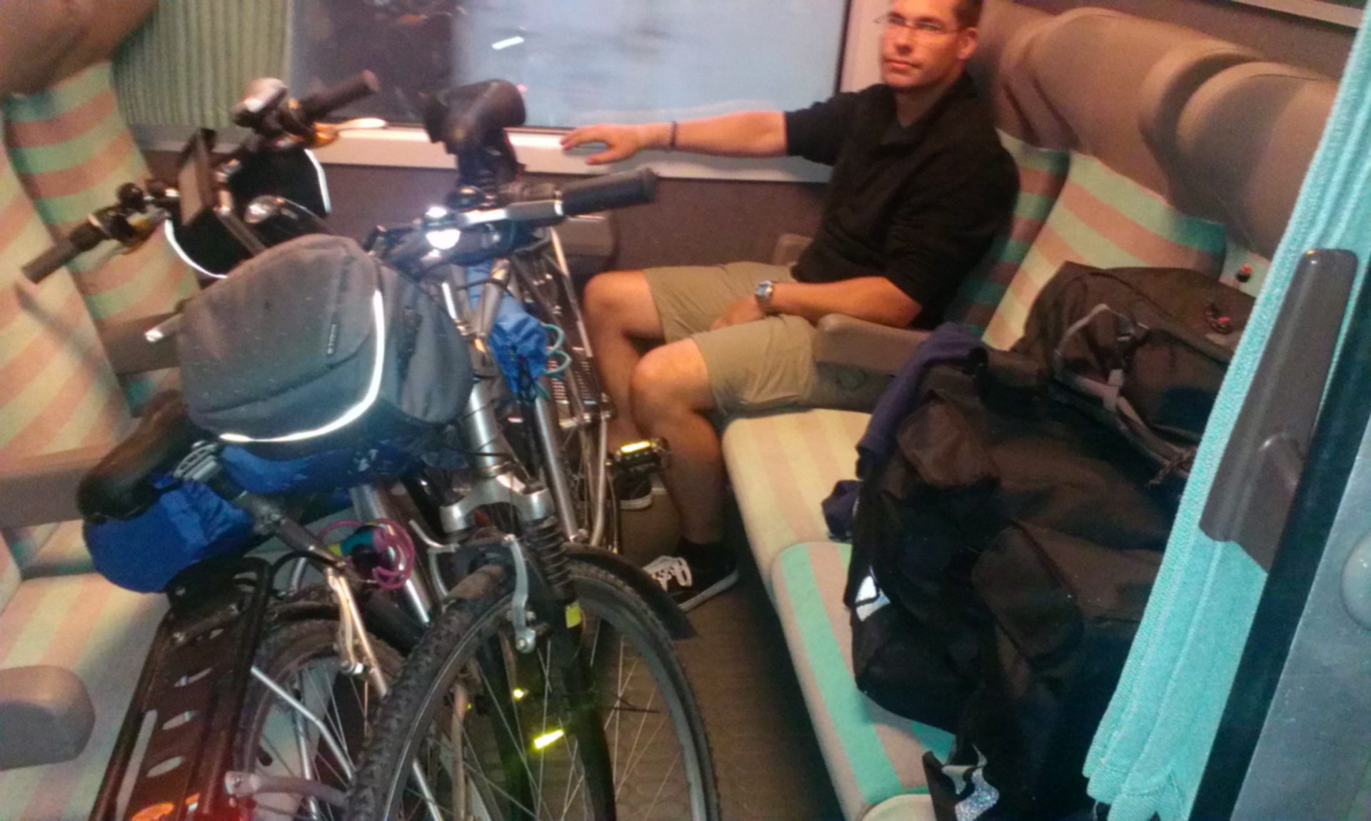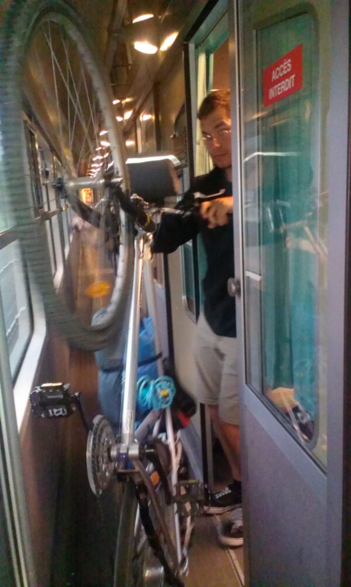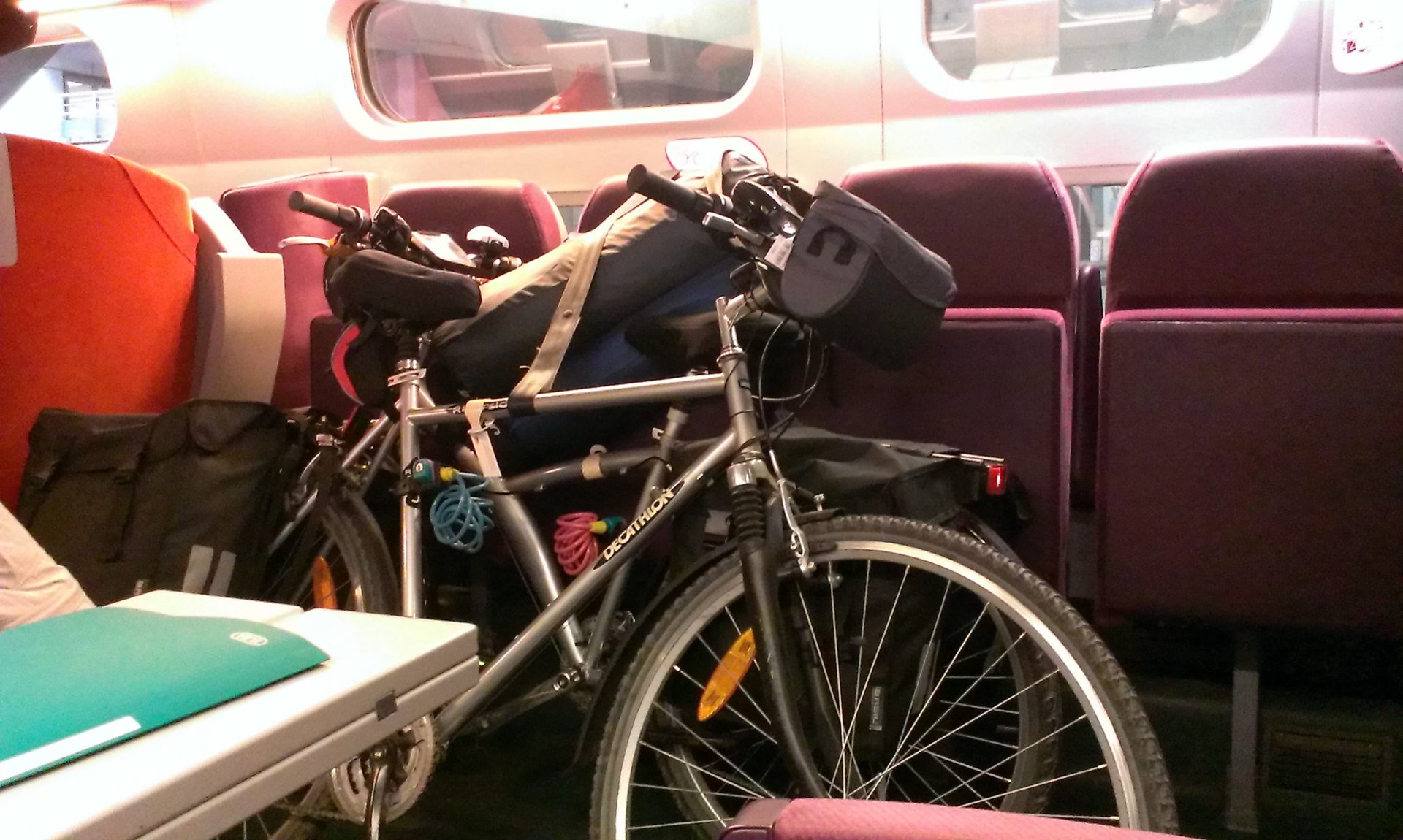 Le retour est compliqué. Il n’y a plus de place vélo dans le TER (tout les cycliste préfèrent rentrer avant la tempête). Nous sommes obligés de démonter les sacoches et la tente et de monter les vélos en force dans le train qui ne s’arrête pas longtemps (nous allons avoir des bleus).