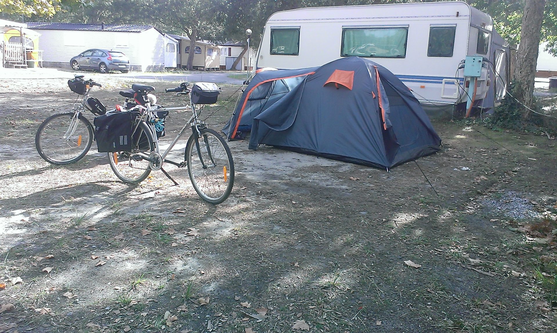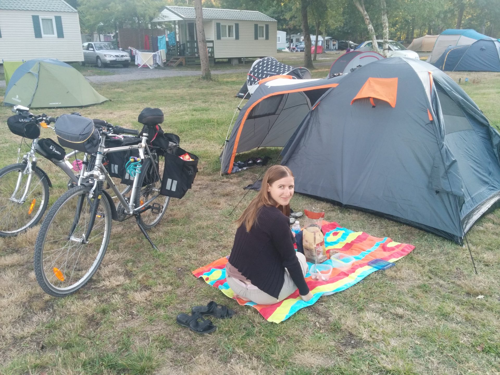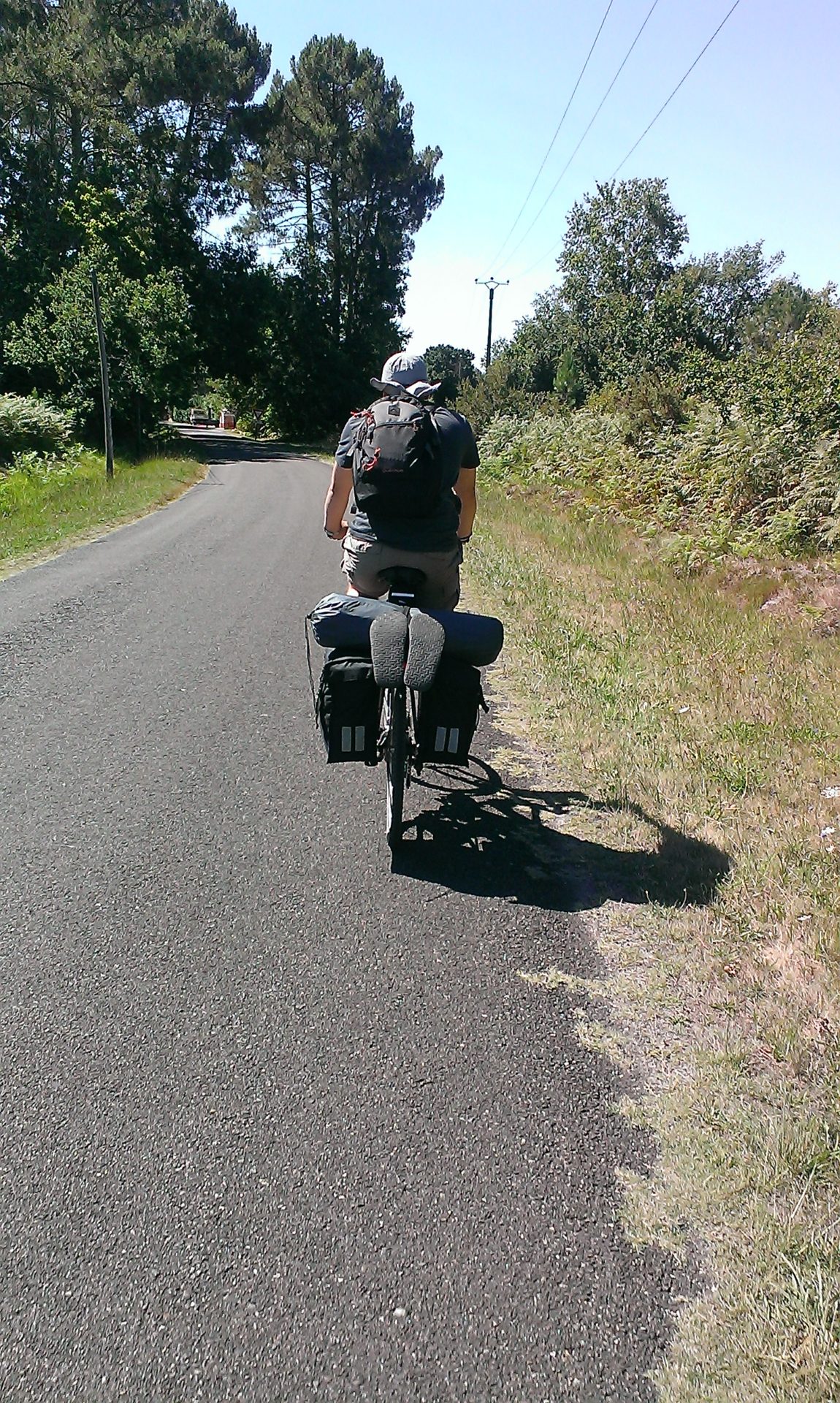 Après cette nuit désastreuse en route vers Contis. De longs chemins au milieu de la forêt de pins, ça nous permet de nous ressourcer après les doutes que nous avons eu hier: devons nous continuer notre voyage? Oui! Nous nous arrêtons au phare de Contis puis surprise: il y a pleins de grosses côtes pour aller au camping qui est très moyen. Le seul avantage: nous avons pu choisir notre emplacement, nous en avons pris un avec un abri pour protéger la tente du vent et de la pluie prévus pour cette nuit. Aujourd’hui 33 kms