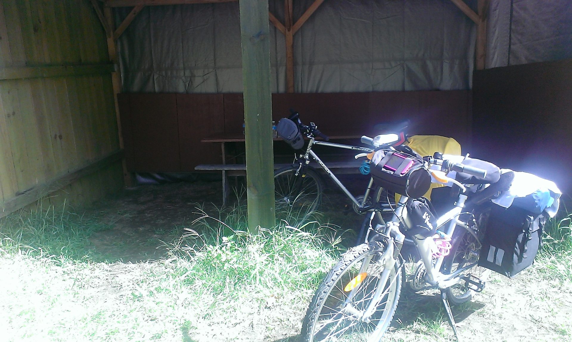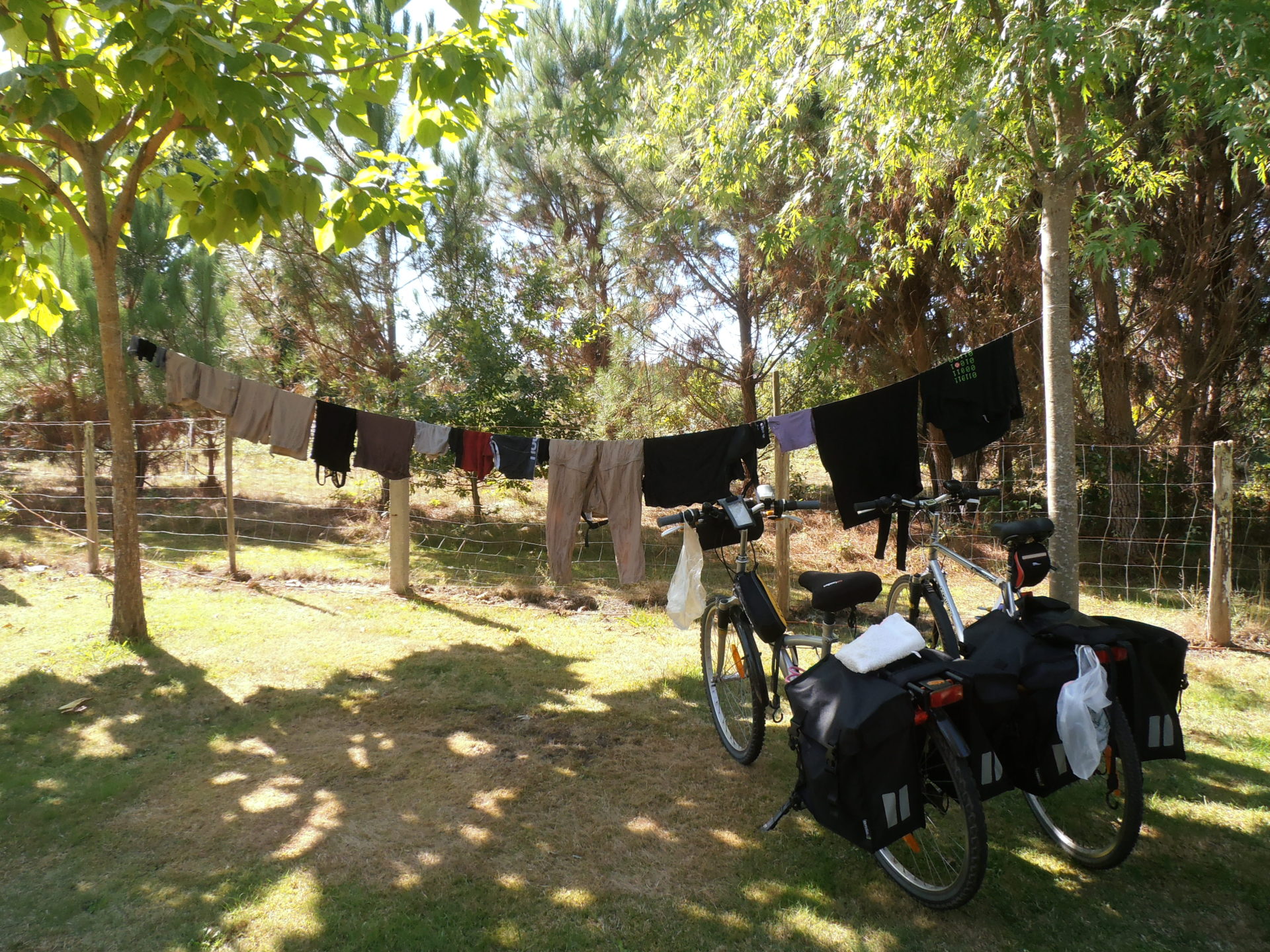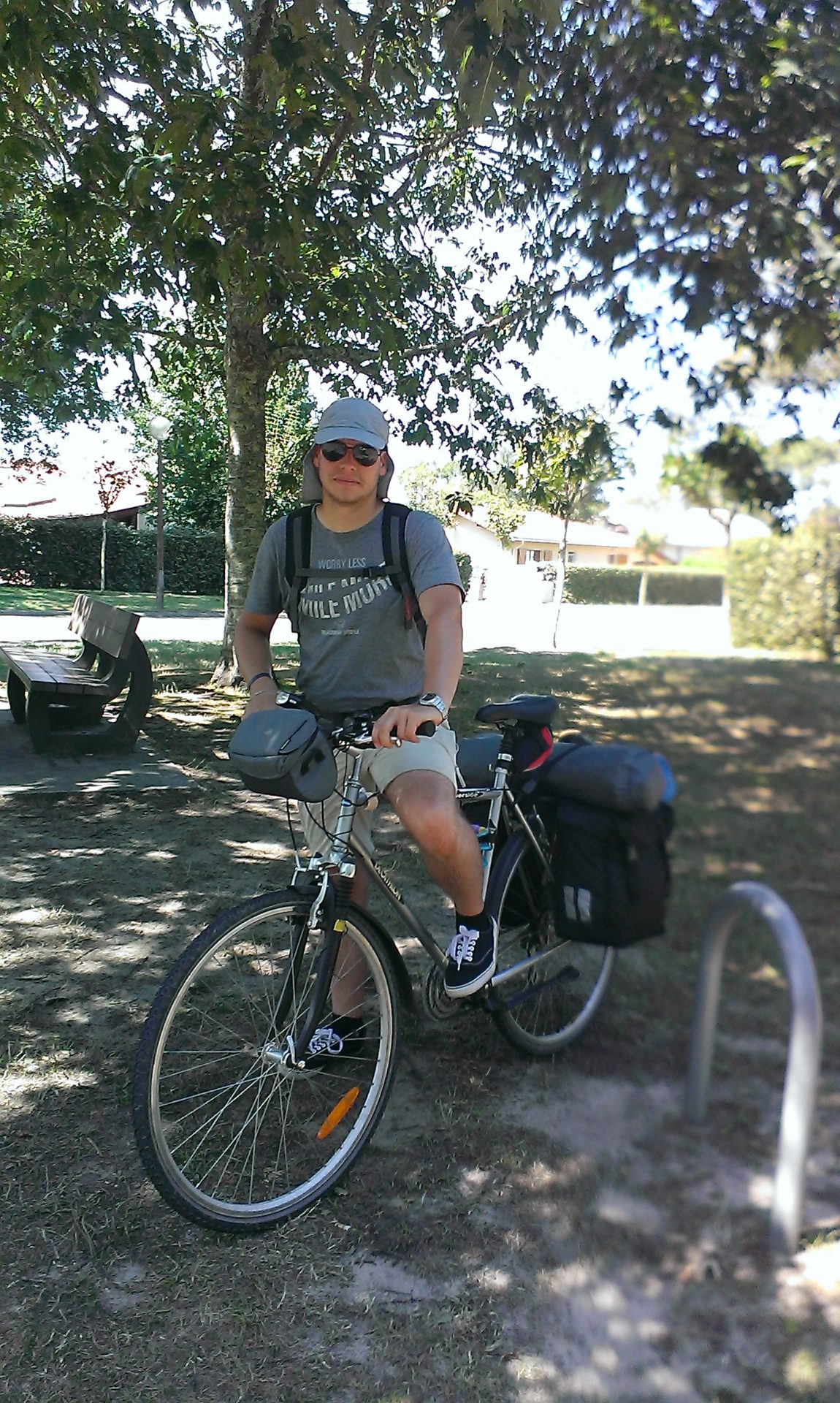 Après cette nuit désastreuse en route vers Contis. De longs chemins au milieu de la forêt de pins, ça nous permet de nous ressourcer après les doutes que nous avons eu hier: devons nous continuer notre voyage? Oui! Nous nous arrêtons au phare de Contis puis surprise: il y a pleins de grosses côtes pour aller au camping qui est très moyen. Le seul avantage: nous avons pu choisir notre emplacement, nous en avons pris un avec un abri pour protéger la tente du vent et de la pluie prévus pour cette nuit. Aujourd’hui 33 kms