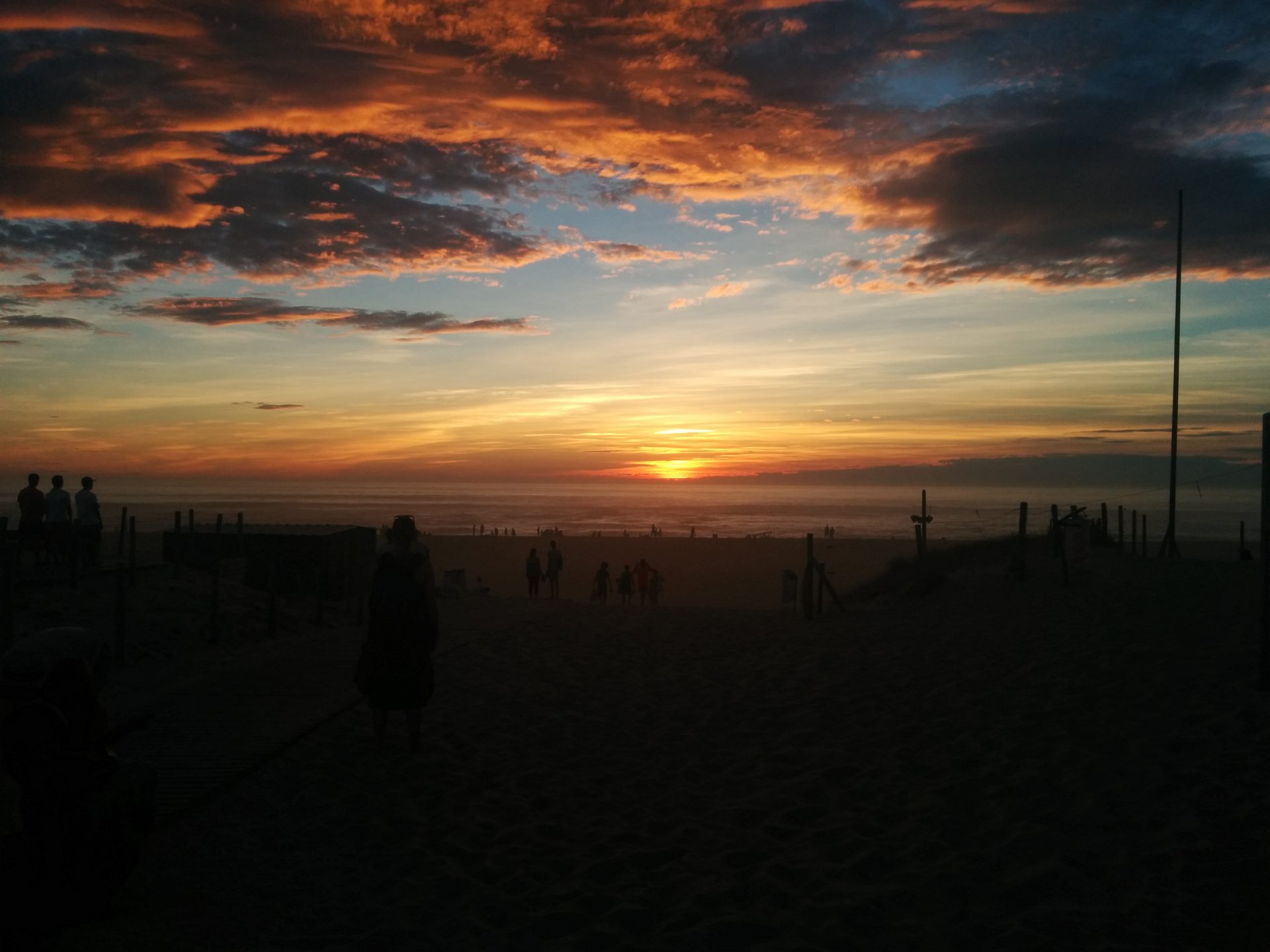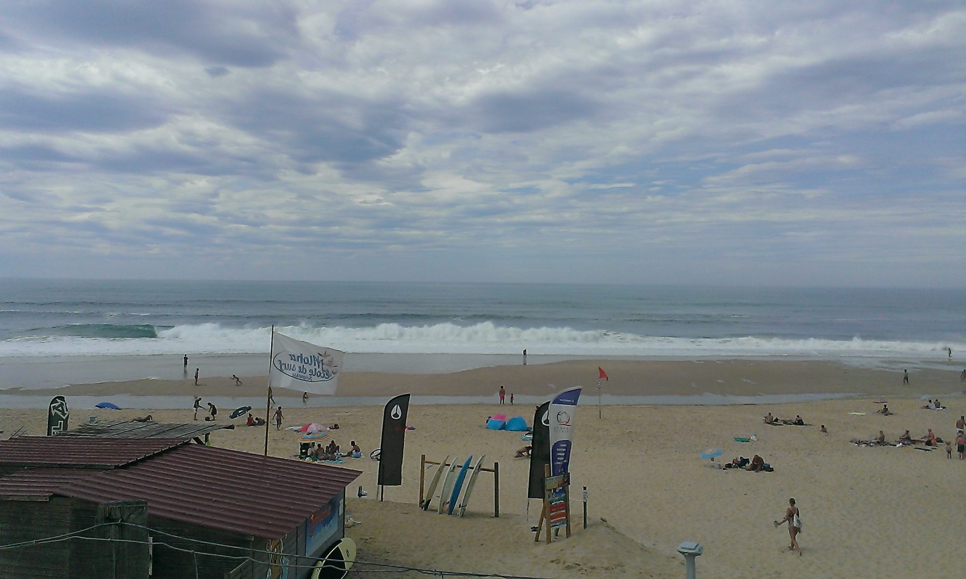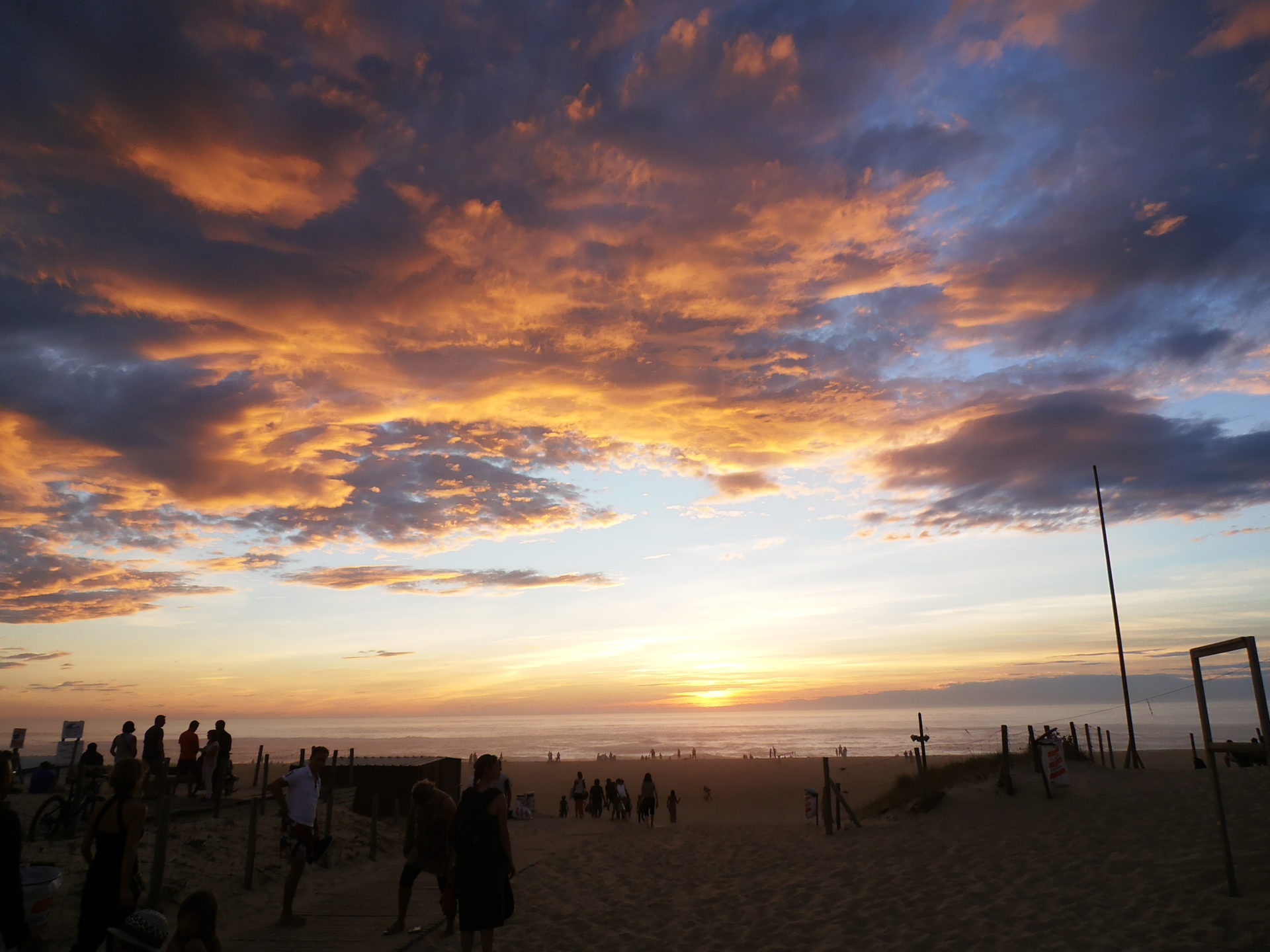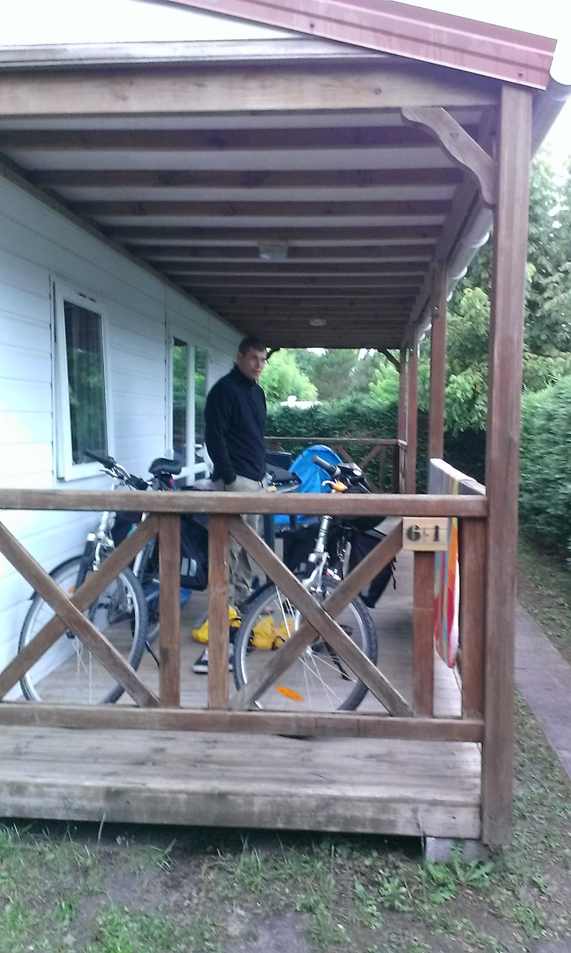 Nous attendons que la pluie se calme pour replier la tente. Après avoir roulé jusqu’à Mimizan, nous montons la tente et… elle casse! Nous essayons de la remonter mais rien n’y fait. Nous changeons notre programme et allons dans le bourg pour trouver un plan B. Sur la route, Anto crève un pneu! Nous poussons jusqu’à un réparateur puis, après quelques courses, nous trouvons une petite tente de secours. Nous en profitons pour passer aux fêtes de Mimizan puis allons nous installer au camping. l’orage arrive: éclairs, vent, fortes pluies, la tente fuit un peu puis beaucoup, l’eau monte! Nous sommes obligés de partir. Nous avions repéré un mobilhome non loué donc nous avons installé notre mini tente se secours sur la terrasse couverte pous finir la nuit au sec. Tout est trempé mais peu à peu les affaires (et nous!) sèchent.