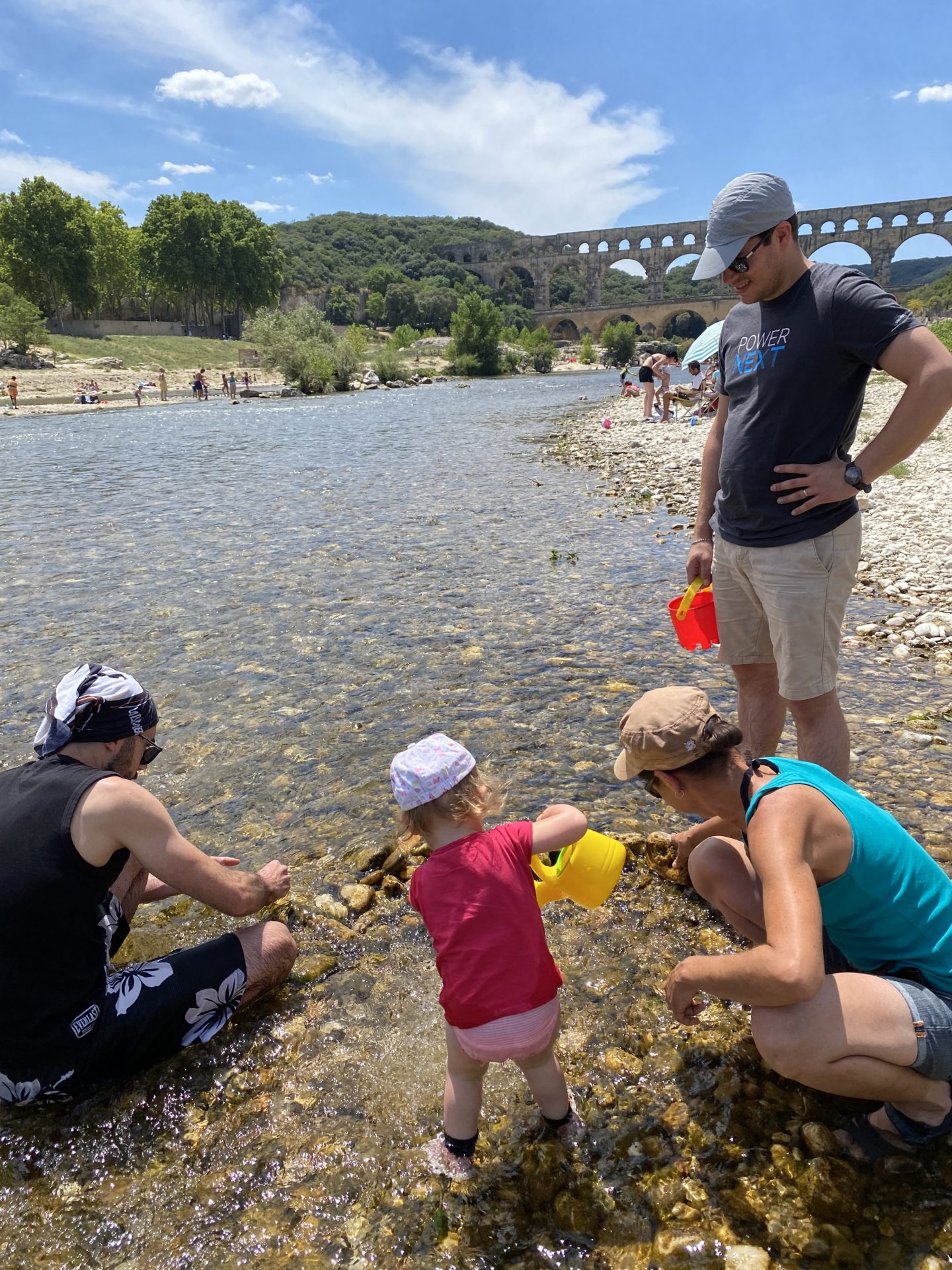 Baignade au Pont du Gard: Nous avons passé une superbe journée au Pont du Gard avec nos amis. Après avoir traversé le Gardon (oui oui avec la mini globe-trotteuse et la poussette!), nous nous sommes installés sur la plage pour le pique nique et la baignage. Tout le monde a bien profité avec une vue sur le Pont du Gard. Elia s’est amusée toute la journée dans l’eau (malgré la fraîcheur). Puis nous avons suivi un des nombreux chemins partant du pont pour en visiter les alentours.